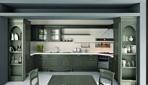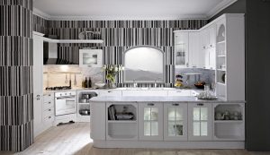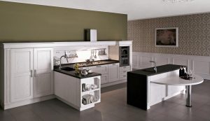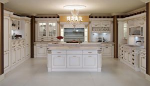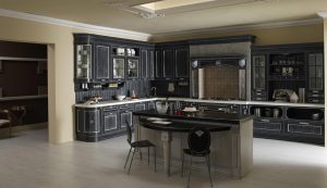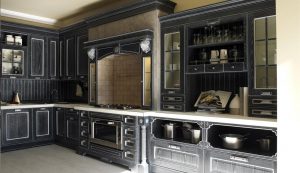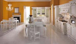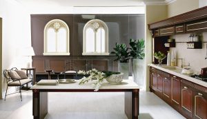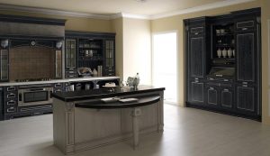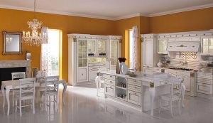 El cuidado de los detalles, como los grabados acanto sobre el fregadero con respaldo o el grifo oro brillo con pomos decorados con verdaderos cristales Swarovski, rinde único y exclusivo cada ambiente.